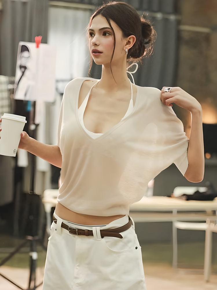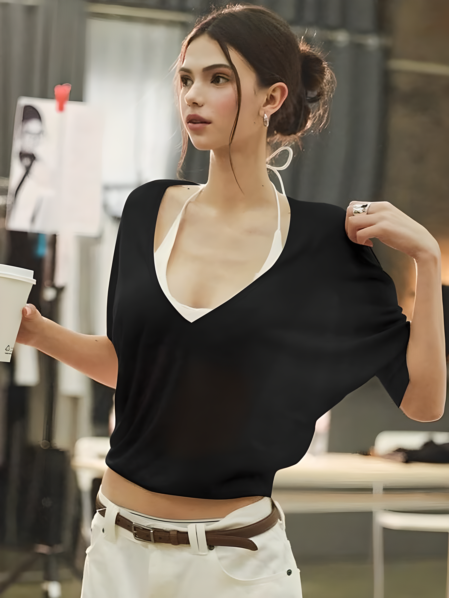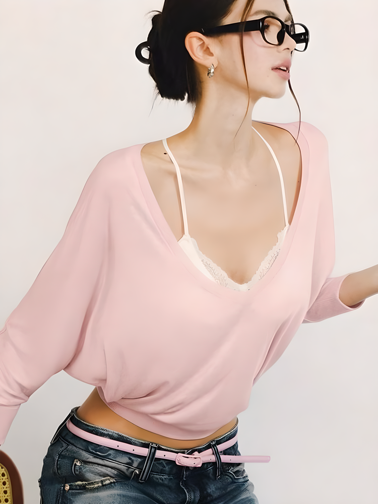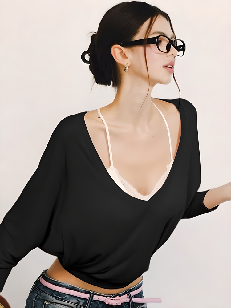 Women's Solid Color Sheer V Neck Long Sleeve Loose-Fit T-Shirt Top